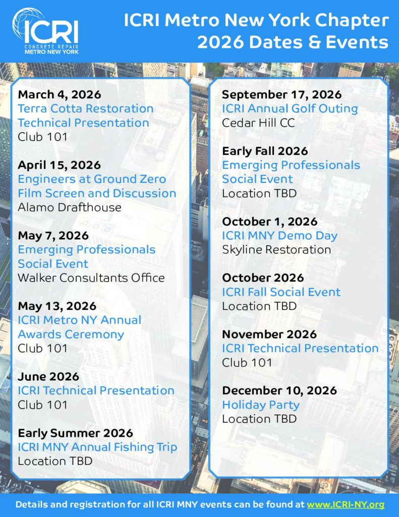 Connect with industry professionals, access valuable technical programs, and stay engaged in the concrete repair and restoration community. Membership offers education, networking, and leadership opportunities throughout the year. Use the button below to jump to ICRI.org where you can learn more about joining ICRI. Make sure to designate Metro New York as your home chapter!